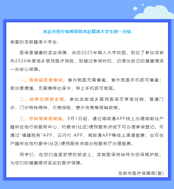 龙岩市医疗保障局致龙岩籍准大学生的一封信