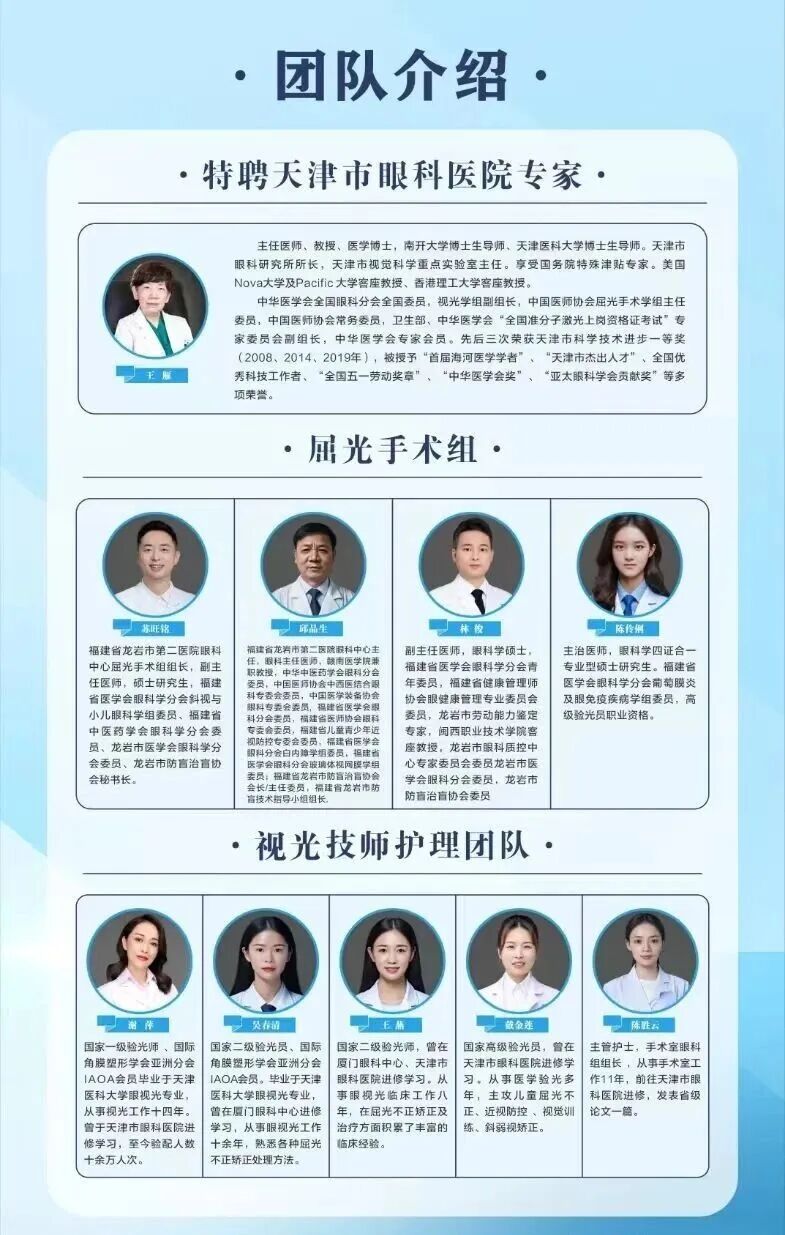 作为是国家卫健委“健康快车”眼科中心,龙岩市第二医院眼科综合实力居省内一流行列,拥有专业的屈光手术团队和视光技师护理团队。依托于国内一流的天津市眼科医院的帮扶与自身的努力,在科研、教学、业务能力、疑难眼病诊治等各方面都取得了卓越成绩。