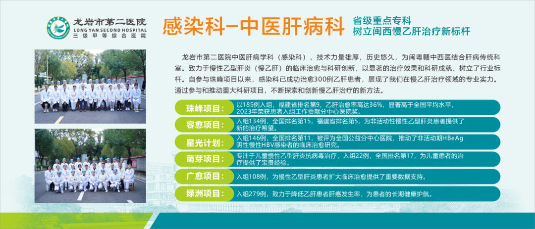 龙岩二院感染科自2018年始加入“中国肝炎防治基金会”,参与多个乙肝临床治愈项目,包括珠峰项目、星光计划、七星计划、广愈项目、容愈项目、萌芽项目、赢领项目等,2025年6月凭借48.5%的乙肝临床治愈率(检测转阴)在400多家分中心医院中强势突围,排名第十,荣获“先进分中心医院”称号。